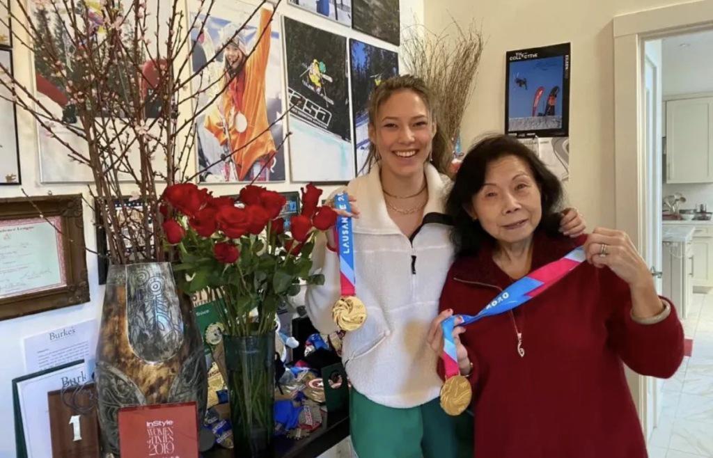 谷爱凌在赢得洛桑冬青奥的奖牌之后,和外婆分享胜利喜悦